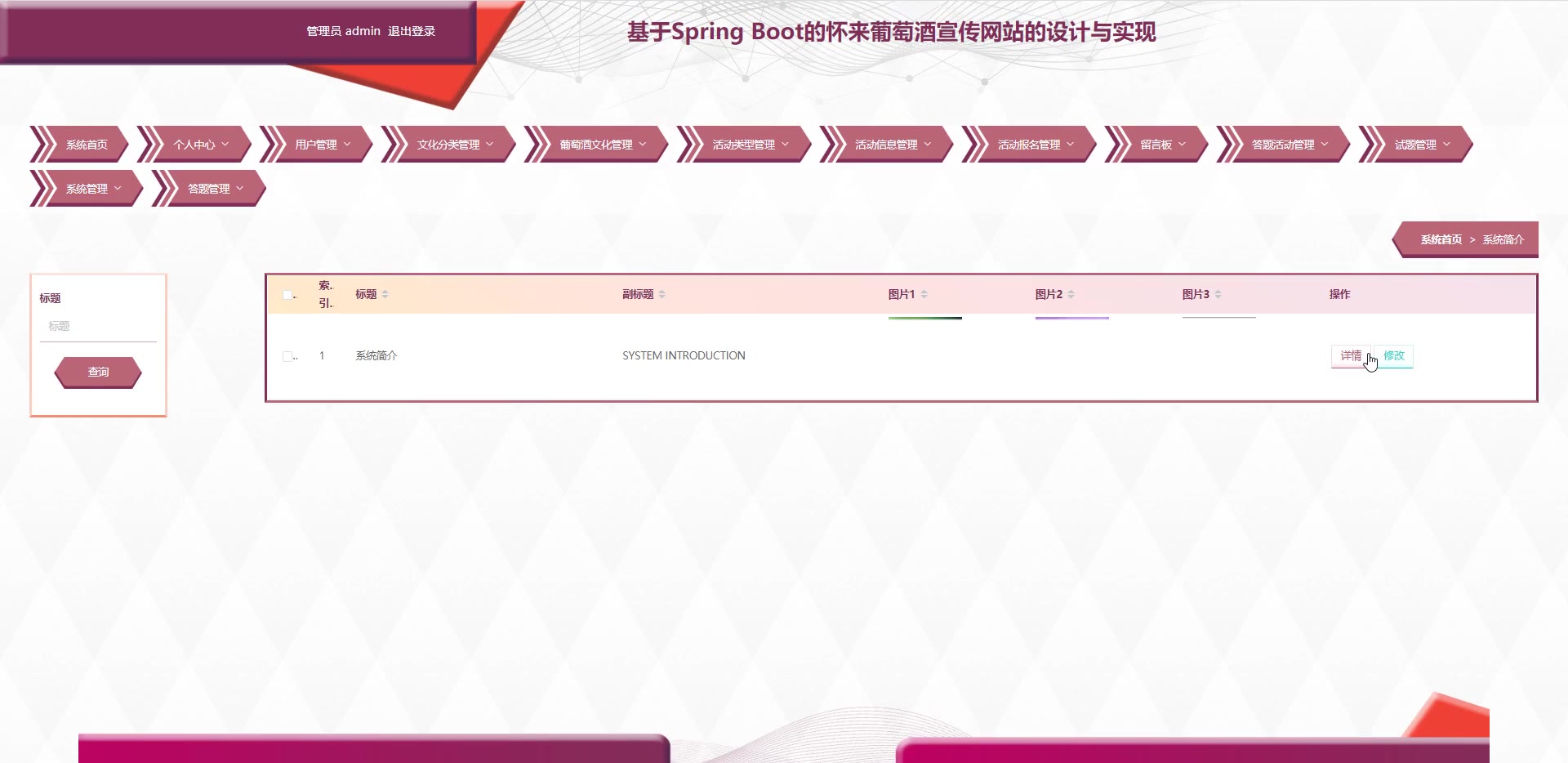 基于SpringBoot vue怀来葡萄酒宣传网站源码和论文答辩PPT984